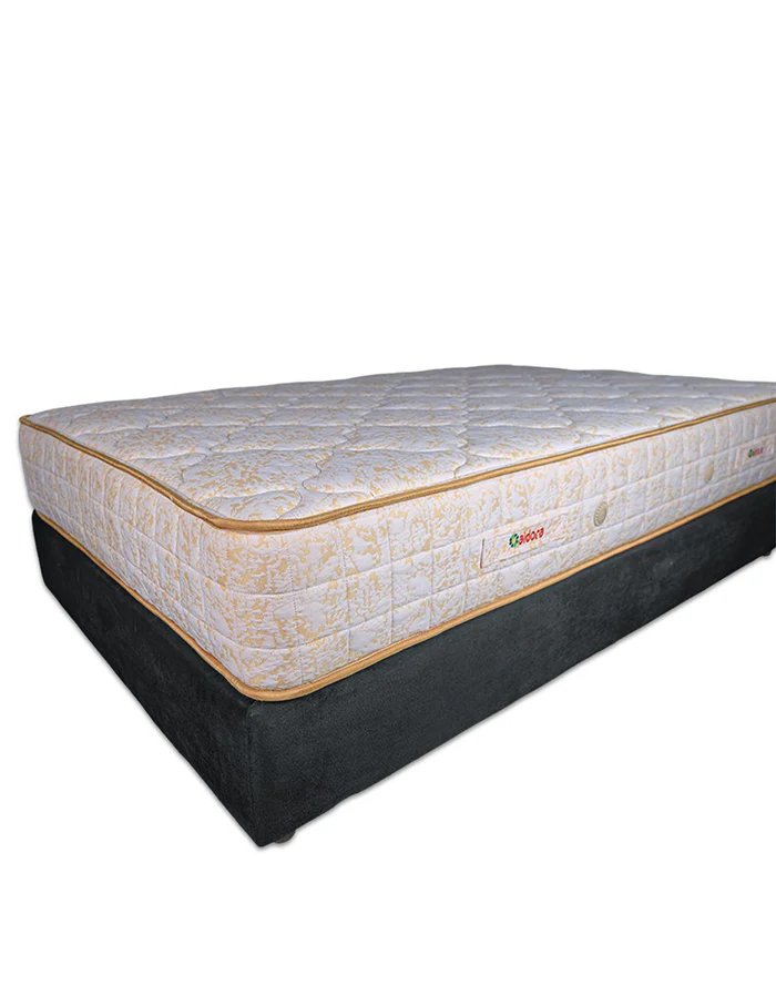 قماش فاخر من القطن المصري ذو جودة عالية، مزود بطبقتين من الإسفنج سوبر سوفت وطبقة من الفايبر رول البولي داون بوزن 300 جرام/م²، ومثبت بطبقة من الفازلين القوي للحفاظ على الإسفنج من التأكل.